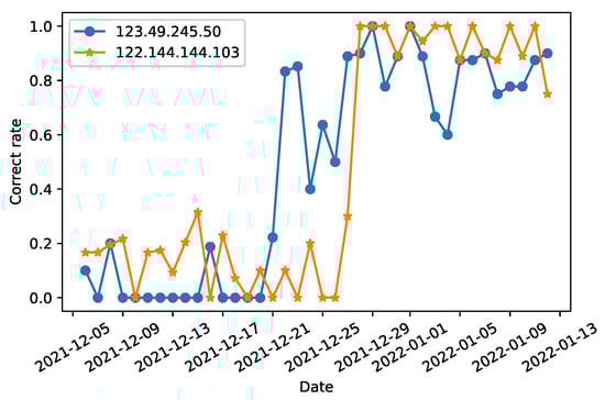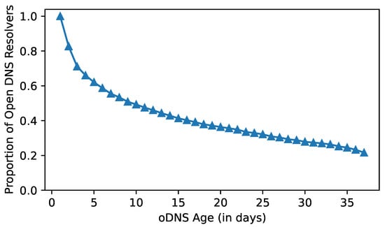 As of 12 January 2022, Shanghai cities have a total of 86,844 open DNS resolvers. Marc et al. [33] observed that open resolvers experience a significant churn rate over time, particularly during the first week. As a result, we determined the churn rate of open DNS resolvers to decide whether or not they continue to provide DNS service over time, as illustrated in Figure 3. Additionally, because a resolution’s stability is crucial to the public service and its users, a well-maintained resolver should avoid prolonged outages [34]. As a result, we decided to concentrate our research on open resolvers capable of providing stable domain name resolution services for at least 30 days. In the end, we obtained 23,669 open DNS resolvers in Shanghai.