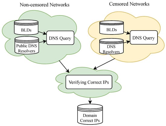 We resolve blocked domain names using three different types of DNS resolvers and check to see if the DNS answers include correct IP addresses. If the DNS response does not include the valid IP address, it is false. Therefore, first, we have to obtain and verify the correct IP addresses of the blocked domains.