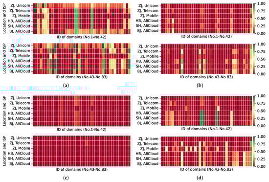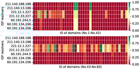 The ACR of the non-Chinese public DNS resolver answer is less than 1% (the red square shown in Figure 6) for blocked domain name lookup requests made through the DNS filtering devices, which is essentially the same as the results from the previous study [11,27]. As illustrated in Figure 6, DNS response results for each blocked domain name are queried from Beijing’s vantage points to Google resolver 8.8.8.8. Moreover, the response results in other places (different regions and ISPs) are essentially the same. The nation-level DNS filtering mechanism affects the DNS resolver 45.63.86.214 that we built in the United States.