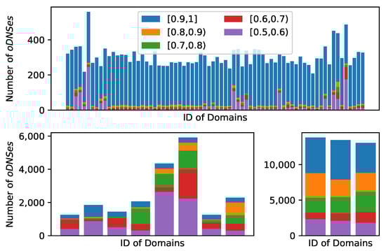- oDNS Charactering Stage. At this stage, we request DNS queries for the matching domain name from “valid” open DNS resolvers (identified in the previous stage). Then, using the correct IP addresses of blocked domains, the response of the open DNS resolver is studied, and the open DNS resolver’s features are comprehensively determined.