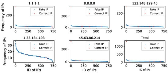- Domain IP Obtaining Stage. This stage’s primary objective is to obtain the blocked domains’ IP addresses from a large number of DNS resolvers. The interval between queries for a specific domain name to a specific DNS resolver must be greater than the domain name’s TTL (Time To Live). Additionally, the number of domains (e.g., 83 domains are used in this paper) in the blocked list should be sufficient to ensure the system’s high accuracy rate. Finally, as previously stated, Chinese public DNS resolvers have a higher possibility of replying to the correct IP address, and the more resolvers there are, the more IP addresses can be retrieved.