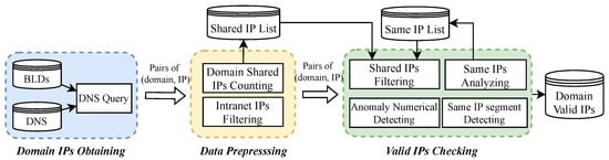 As shown in Figure 21, the correct IP identification system consists of three main stages: Domain IPs Obtaining, Data Prepressing, and IPs Checking.