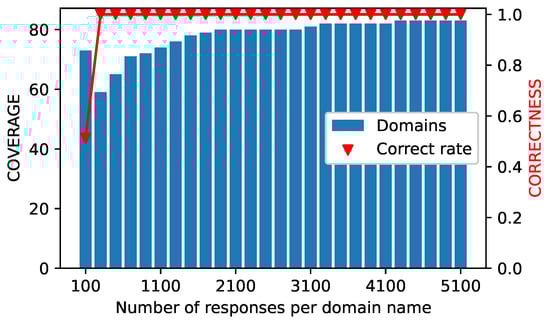 Finally, we assess our method using the DNS records obtained in this paper for the blocked domains. That is, the system utilizes 14 DNS resolvers (four non-Chinese pDNS, seven Chinese pDNS, and three iDNS) to retrieve valid IP addresses for 83 blocked domains. We randomly picked a predetermined number of DNS records for each domain name obtained, repeated the selection ten times, and calculated the average CORRECTNESS and COVERAGE values to evaluate the system’s performance, as shown in Figure 22.