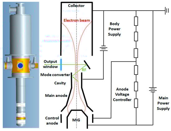 The MIG is the electron source in the gyrotron, consisting of an annular emitter mounted on a cathode, an accelerating anode, and a modulating anode for the triode-type case. It allows greater flexibility in controlling the beam parameters compared to the diode-type MIG configuration. The pitch factor can be modulated independently with other parameters, which is the most significant advantage of the triode-type MIG. This means that the pitch factor , the electron cyclotron angular frequency in the cavity , and the electron beam position in the cavity can be optimized independently by controlling the magnetic field in the resonator and modulating anode voltage during the oscillation.