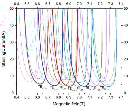 Starting current versus magnetic field for various modes operated at the nominal design parameters of the 170 GHz gyrotron.