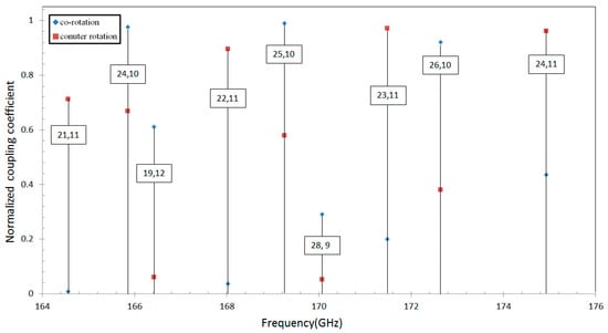 To study the feasibility of the TE25,10 mode operation, the starting currents under possible competing modes were calculated following a linearized single-mode theory [,], to determine whether the cavity was operating in the desired mode. Competing modes had closed starting currents distributed in different magnetic field values, as shown in Figure 2. The TE25,10 mode could oscillate in a narrow range stably; Figure 3 shows that the nominalized coupling efficient value as a function of frequency while taking the co-rotation TE25,10 as the main mode (the radius of electron guide center was 7.4 mm. From these two figures, we can find that the TE22,11 and TE23,11 modes have a similar magnetic field for the starting current and a similar frequency in terms of the coupling coefficient to the TE25,10 mode than with other modes. The TE22,11 and TE23,11 modes have similar value of starting current and may avoid competition by accurately modulating the magnetic field. In fact, due to the coupling coefficient of co-rotation for the TE22,11 and TE23,11 modes being as low as possible, as shown in Figure 3, the competition of these two modes with TE25,10 mode can be ignored. And in Figure 3, we can see that the major competing modes, TE24,10 and TE26,10 for TE25,10, are fairly well separated. Considering the higher longitudinal index modes, ones can ignore the modes of TE25,10,2 and TE25,10,3, because they have much lower quality factors than the modes whose value of q is 1 (i.e., the TE25,10,1 mode in the present case) [,]. Hence, the TE25,10 mode was chosen as the operating mode for the 170 GHz gyrotron.