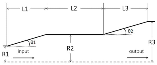 On the basis of the TE25,10 mode, a hollow resonator with a down taper of 5° and an up taper of 3° was designed, as shown in Figure 4. The length of the cylindrical part was smoothly rounded over a length of 1.75 mm and 1.05 mm for input and output, which could prevent mode conversion in the cavity. According to a cold cavity simulation, the diffraction Q-value of the resonator was 1843.5 for the 170 GHz gyrotron.