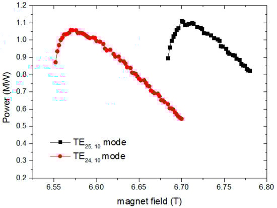 Figure 5 shows the output power versus magnetic field for the TE25,10 mode with a beam current of 40 A and an accelerating voltage of 80 kV, corresponding to CW operation, guiding the choice of the best operating parameters for the experiments. It can be seen that 6.72 T was the optimized magnetic field for the 170 GHz resonator with the parameters shown in Table 3, with a peak power of about 1.1 MW and an efficiency of 35.3%. The simulation showed that the TE24,10 mode would oscillate under the lower magnetic field and the peak power was less than that of the TE25,10 mode.