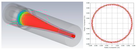 Trajectory of the electron beam simulated by CST. In the right image, a thickness of 0.4 mm can be observed for the electron beam injected into the resonator.