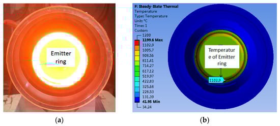 Temperature experience and simulation: (a) the temperature of the emitter ring (highlight circle) was approximately 1048 °C during testing; (b) the temperature of the emitter ring was approximately 1100 °C according to the simulation.