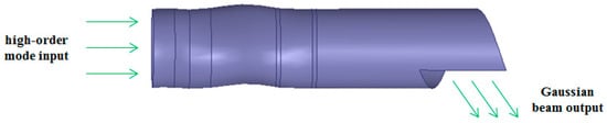 Figure 9 shows the model of the TE25,10 Denisov-type launcher, where the radius of the helical converter can be described by the following wall perturbation []: