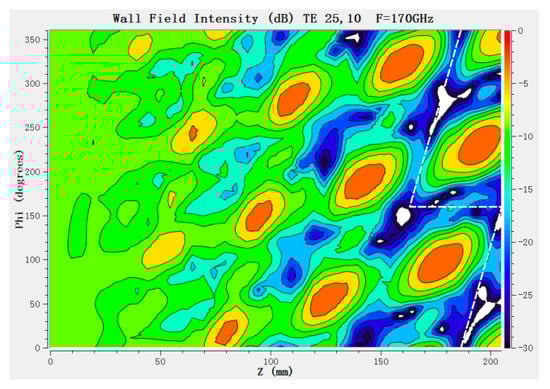 In Equations (4)–(6), and , z is the axial coordinate, and is the angular coordinate; and are the amplitudes of launcher deformation. According to the numerical simulations, the efficiency of the launcher was about 99.6%, and the aperture field Gaussian content was approximately 91%. The field distribution of the Denisov launcher is plotted in Figure 10.