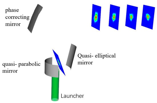 In general, some high-order modes were mixed in the fields reflected by the quasi- parabolic mirror and the quasi- elliptical mirror, which propagated to the transmission line at relatively large angles; thus, power was lost in the transmission. In the quasi-optical system, some points do not exist along this direction, because their paths differ in the transmission line. Therefore, phase-correcting methods were used to optimize the distribution and suppress the undesired modes. As shown in Figure 11, the mirror system constituting a phase-correcting mirror was established, where the content of the Gaussian component in the gyrotron window was 92.8%, and the radius of the Gaussian beam was about 50 mm.