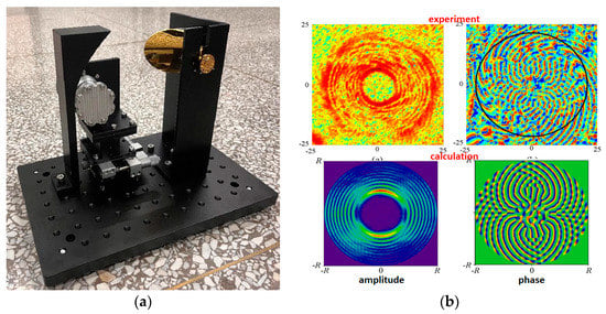Combined with the BUAA (Beijing University of Aeronautics and Astronautics), we established the TE25,10 mode generator and measured the output aperture field distribution, as shown in Figure 12. The experimental results showed that the amplitude and phase were close to the simulated result, but the content of the TE25,10 mode component was not ideal. The efficiency of the coaxial cavity was relatively low, while the power reflected by the quasi-parabolic mirror was about −25 dBm, and the output power of mode generator was in the range of −140 dBm to −65 dBm. We are currently optimizing the mode generator and test methods to improve the precision of the mode converter measurement system.