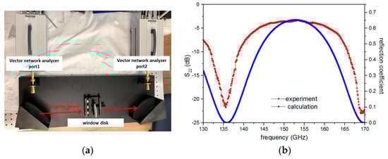 Measurement system and result of window measurement: (a) measurement system of window; (b) experimentally measured and calculated reflection coefficients of sapphire window.
