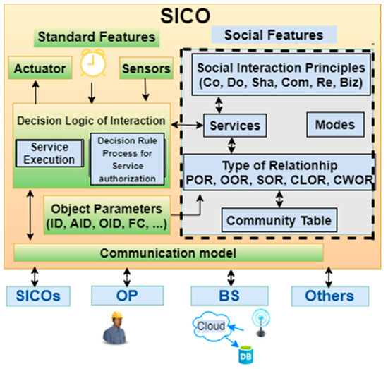 Smart objects, which are self-contained objects of high sensing, processing, and network capabilities, are categorized as objects sensitive to activities, policies, and processes, and are seen as building blocks of IoT to meet functional needs [25]. By extension of the SICO model in the works of [26,27], a Social Industrial Communicating Object (SICO) can interact with other SICO in its environment by integrating relational paradigms inspired by human social interactions. In Figure 4, an architecture of the SICO is represented in which this architecture is based on the classical architecture. A SICO is characterized by elements inspired by the social approach, while the social aspect is defined by three main points, which are: the attributes of an object, services, and social group.