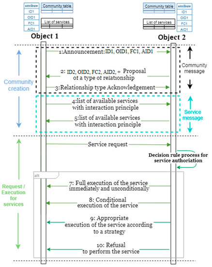 At first, an object announces itself in a Push mode, which is well suited to the autonomy and mobility of objects [31]. This mode is the appropriate message communication protocol for IoT devices because it is built into a low bandwidth network [32,33]. Once it detects an object nearby, it asks for its settings to determine what kind of relationship it can make. Each object then discovers the list of services offered.