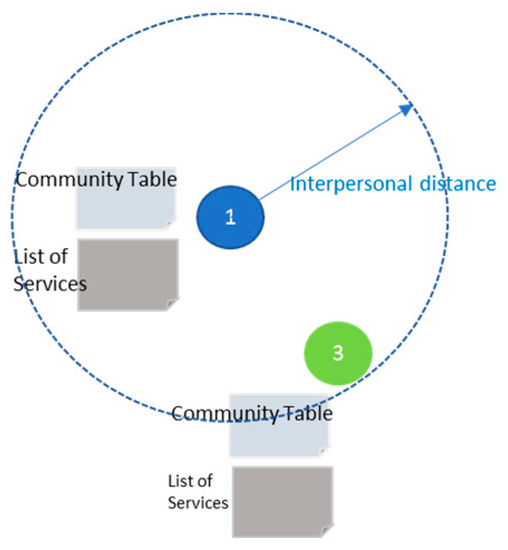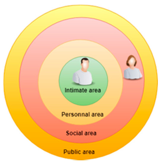 The established distance zones are represented in Figure 7. For example, for a COVID-19 safe area, one has to keep a distance of at least two meters from others. This example can be considered as a social area.