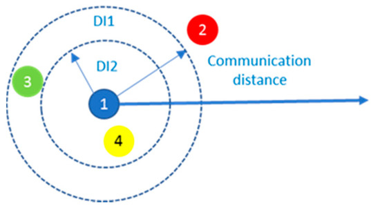 We notice that object 2 does not belong to the interpersonal distance of object 1 so it receives messages from object 1, but they cannot communicate with each other. Objects 3 and 4 can communicate with object 1, with a possible treatment differentiation according to the interpersonal distance DI1 and the interpersonal distance DI2 from what they are in relation to the object 1.