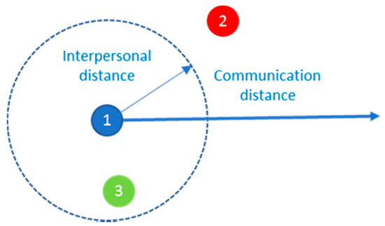 The notion of interpersonal distance is the distance in which each contact is characterized by a distance that must be respected for the contact to be effective and comfortable for all. Some people need the space around them to feel safe, and others appreciate closeness and even physical contact. By adapting to this distance, to the lack of passion or mistrust or on the contrary we ensure the desire to engage in conversation, the desire for intimacy. Things like people, relationship type, and some personal factors influence variation in interpersonal distance. As shown in Table 2, Edward T. Hall experimentally determined the existence of four physical distance zones in humans: they are the intimate, personal, social, and public areas. Each of the distances has two modes, near and far [34].