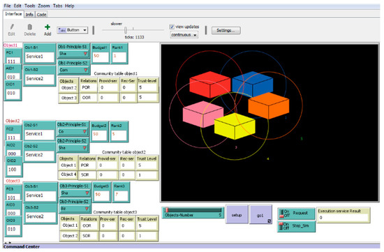 We implemented and simulated our model in the NetLogo simulation environment. NetLogo [35] was designed and written by Uri Wilensky, director of the Connected Learning and Computer-Based Modelling Centre, Northwestern University. It is a programming and simulation language for a multi-agent environment. It can be used for modelling and simulating the social Internet of Things (SIoT) environment [36]. The components of the NetLogo environment are interface, information, and procedures. The elements of the NetLogo environment are patches, turtles, and links. Each object is a turtle under NetLogo, which is a mobile agent in the platform, and it can move, rotate and change color [37].