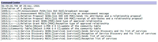 Two types of messages are exchanged between the objects, which are community messages and service presentation messages. Community messages comprise the announcement messages and the messages for establishing a relationship between objects (relationship type proposal message and relationship type agreement/disagreement message). The service presentation message type is used to expose the services available in an object to other objects in the community. With such a message, each object sends a description of the services it proposes to the community.