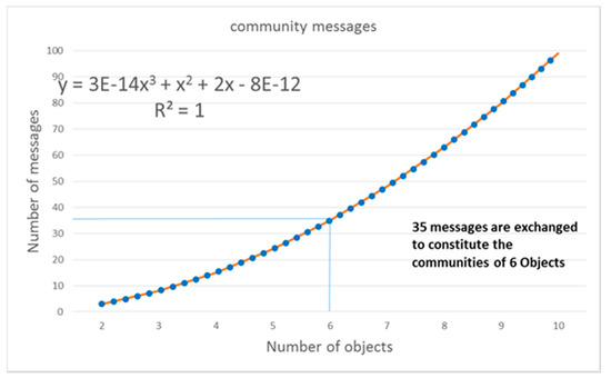 As a result of a NetLogo simulation, the number of community messages exchanged to form a single community of objects is represented by Figure 21. For example, to build a community of 6 objects, 35 community messages are exchanged, which makes it possible to update the community table owned by each object.