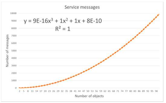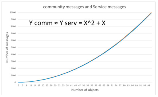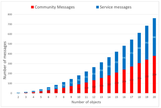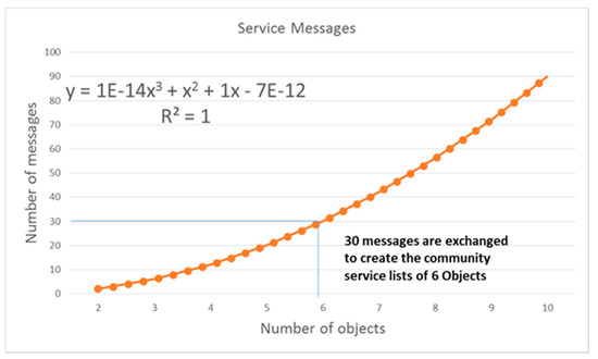 The message traffic generated during the formation of a single community of objects varies according to the number of objects in the community according to the same Equation (9) presented before. For example, to form a unique community of 56 objects, the total number of community and service presentation messages to be exchanged is 6160 to form the unique community of objects. But for the 57th object to enter an existing community of 56 objects, i.e., for it to enlarge its own community and for the other 56 objects to update their communities, it only takes 112 messages from community and 112 service presentation messages. Thus, the traffic generated between objects to form a community of socialized industrial objects is deterministic, easily computable, and it can be calculated a-priori.
