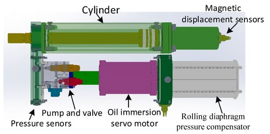Structural design of underwater EHA: An electric servo-motor, micro piston pump, signal rod cylinder, and rolling diaphragm pressure compensator. The addition of a rolling diaphragm pressure compensator is used to overcome seawater pressure.