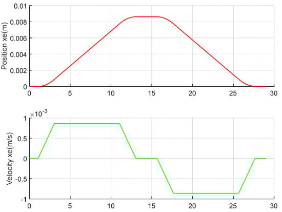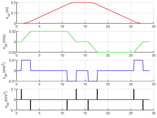 The desired tracking trajectory is designed as a continuous and smooth point–point curve, existing higher derivative, as shown in Figure 3. The uncertain external load . The controller parameters are as follows: , , , , , , , for C1-Hign gain, , , for C1-Low gain; , , for C2. , for C4. , for C5 [35].