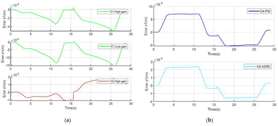 Tracking error. (a) C1−High gain, C1−Low gain, and C2−High gain. (b) C4−PID, C5−ADRC.
