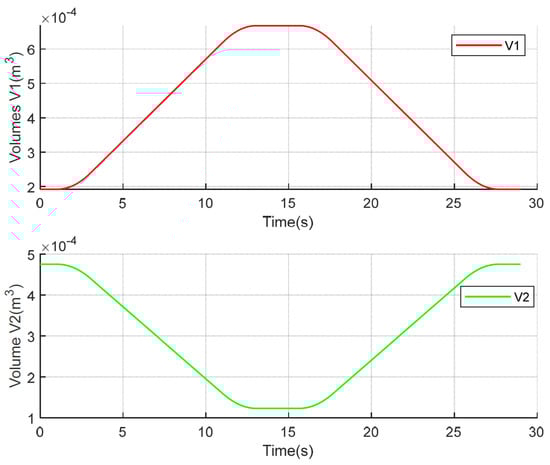 where , represent the total hydraulic compressible volumes when the position is . , are the flow of the two chambers and will be defined later. , are the total leakage of the , chambers, respectively.