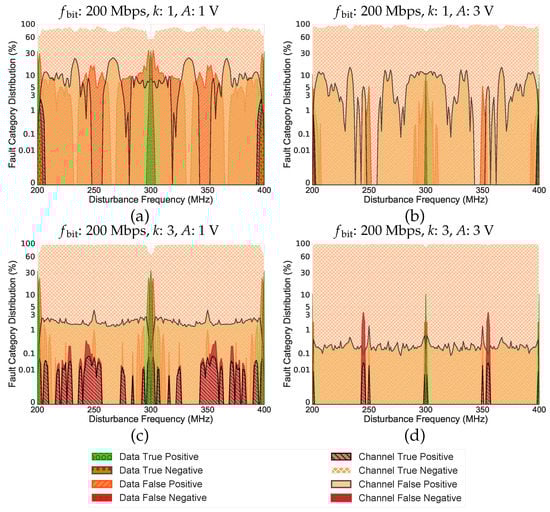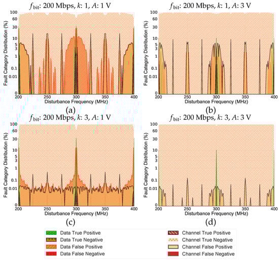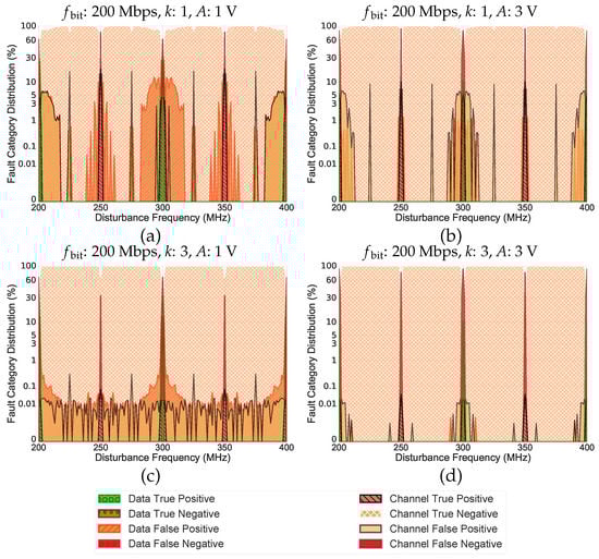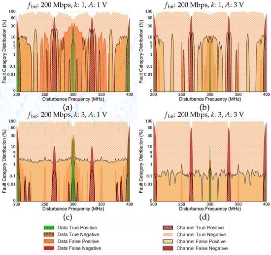 Figure 2a,b and Figure 3a,b show this distribution for a message length of 1 symbol (i.e., ), while Figure 2c,d and Figure 3c,d, under the same setup, represent the fault category distribution for a message length of three symbols (i.e., ). As can be seen in Figure 2 and Figure 3, there are sudden increases in CFN and CTP at specific disturbance frequencies (). These frequencies are dependent on the symbol size (r) and the bit-rate (), as shown in Equation (2).