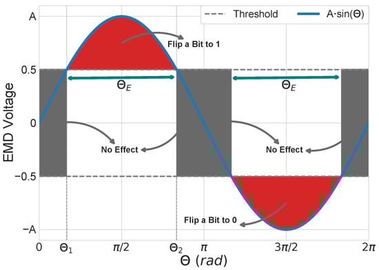 As can be seen in Figure 4, the middle area of the graph has no effect, which, accordingly, results in a DTP. The angle that leads to this category is simply obtained by subtracting the areas responsible for generating bit-flips (i.e., ) from the period of the single-frequency disturbance (i.e., ). Subsequently, the DTP ratio can be calculated with Equation (4). Please note that this ratio only depends on the EMD voltage, and it is independent of the symbol size value (m) and the data word length (k).