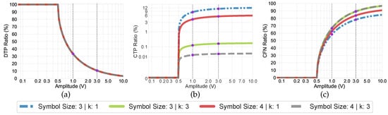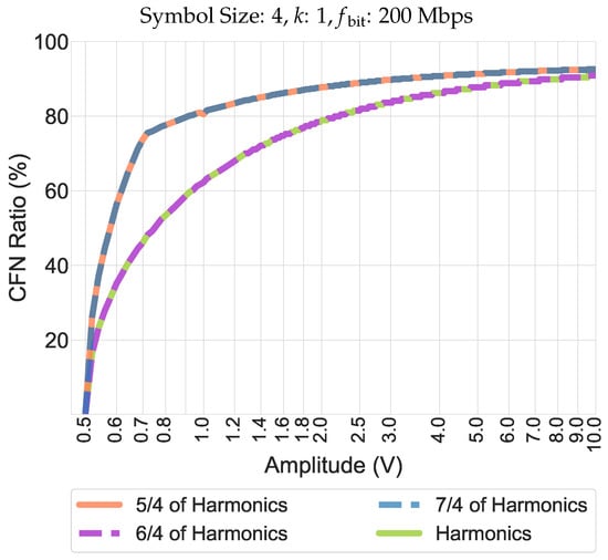 The amplitude of the induced voltage has a noticeable effect on the CTP and CFN ratios at the mentioned peak frequency, i.e., in Equation (2). This effect is clearly observable in Figure 7 in which the increasing trends of CFN ratios for symbol size of 4 at (i.e., 250 MHz, 300 MHz, 350 MHz, and harmonics) have been shown.