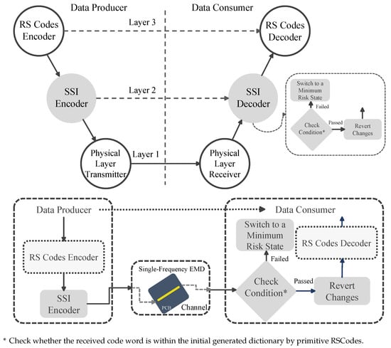 As can be seen, instead of using two layers in the communication channel, three layers are used to overcome the mentioned vulnerability. The SSI encoder at Layer 2 is responsible for applying the inversion to break the repetitiveness in the generated code words by RS Codes encoder at layer 3 and generates a new dictionary. In this new dictionary, one-symbol-value code words, which are mainly responsible for the CTP and CFN at layer 3, are no longer valid, and they can easily be detected by the SSI decoder at layer 2. Accordingly, CTP and CFN at layer 3 convert to CTN at layer 2, i.e., the SSI decoder produces no output by design, which is considered as a “Negative” based on the initial assumption, followed by a “True” detection at the SSI decoder. Nevertheless, although other code words can pass through this layer without any protection regardless of their status, they will be handled by the RS Codes decoder at layer 3. At this layer, the RS Codes decoder performs its normal operation on the received code words. In other words, layer 2 fills the safety gap in the communication channel by addressing the vulnerability of layer 3, i.e., detecting corrupted code words that are not detectable by RS Codes decoder. Accordingly, this combination of layers guarantees a safer operation in the considered communication network.