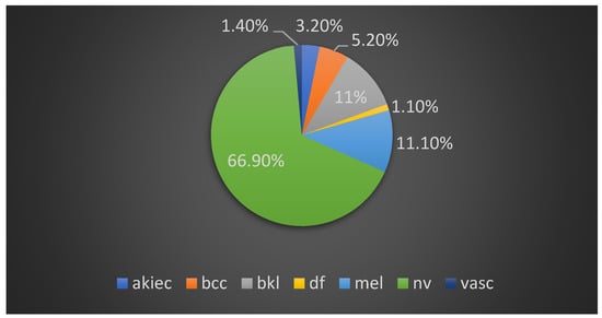 The first problem that was observed is that of the imbalance between the number of images in different dataset classes. For example, the largest class consists of 6705 images, i.e., about 67%. In contrast, the smallest class consists of 115 images, or 1.1% of the base. Figure 1 depicts the percentages of the classes.