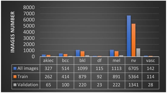 As a starting goal, we set up the creation of a model that achieves high rates in the classification average accuracy of the seven different classes and achieves melanoma detection recall [] similar to that of specialized dermatologists at a rate of 75–84%. At the same time, we had to consider the limited resources of an average mobile phone (RAM and computing power). The first step we made was to split the dataset into training and validation (test) sets with a ratio of 4:1, or with 80% for training data and the remaining 20% for the verification process (see Figure 2).