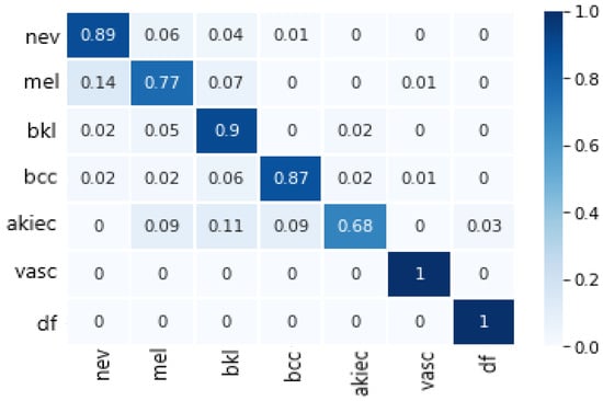 Huang et al. [] built two deep learning models and used two datasets for skin disease classification. First, they built a DenseNet network for the binary (malignant or benign) classification problem based on the Kaohsiung Chang Gung Memorial Hospital (KCGMH) dataset (1287 clinical images certified by biopsy) concerning five classes: BCC, SCC, MEL, benign keratosis and NV. It achieved an accuracy of 89.5%, a sensitivity of 90.8% and a specificity of 88.1%. The second model was an EfficientNet model used for multi-class skin disease classification on two datasets, the KCGMH and the HAM10000 (10,015 dermatoscopic images and seven classes). The EfficientNet B4 version achieved the best overall accuracy results: 72.1% and 85.8%, respectively.
