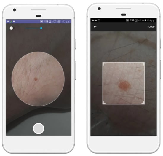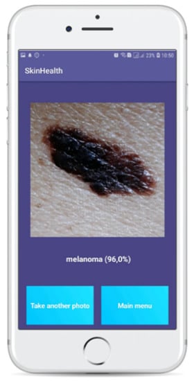 Based on the above two-class model, we created a mobile application for helping people in having a first indication about their skin lesions. Apart from performing diagnoses, the application informs the user about how much time he/she can remain exposed to the sun without any burning, based on the user’s skin phototype, the sun UV indicator present in the user’s area at the given time, and the user’s sunscreen index. To improve the quality of the photos taken by the mobile device, the system allows zooming and cropping.