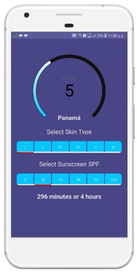 In Figure 7, we show the corresponding snapshot of the application in which we see that in Panama City, the sun UV index is currently 5, and the user with a phototype 1 can stay in the sun for 296 min using a sunscreen with an SPF of 8.