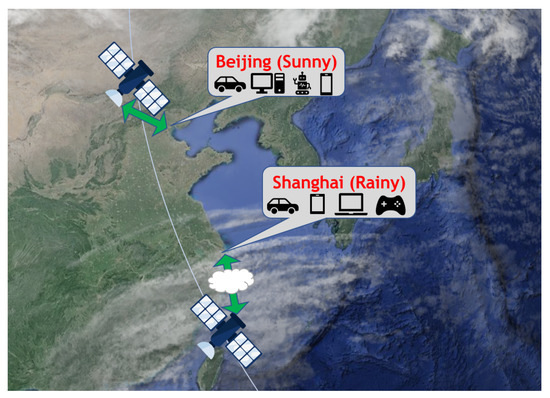 As shown in Figure 1, it is expected that the weather varies from location to location. The satellite over Beijing can choose a coding scheme that can transmit more data because of the clear weather and higher SNR, whereas the satellite over Shanghai can only choose a relatively conservative coding scheme because of the interference from clouds and low SNR. The SNR of the communication link is mainly determined by free-space loss (FSL) and rain loss. However, the current margin value accounting for rain loss is tremendous, which results in the waste of spectrum, so we can dynamically adjust the coding scheme according to the SNR to make full use of the spectrum source.
