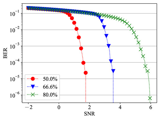 Now that we have obtained an estimate of the real-time SNR, the next task is to select a suitable redundancy rate. The communication coding standard proposed by the consultative committee for space data systems (CCSDS) for use in LEO satellites, uses the accumulate-repeat-4-jagged-accumulate (AR4JA) [37] code was constructed from the protograph based on LDPC, using three data rates of 50%, 66%, and 80%. As is shown in Figure 2, each data rate will have a specific BER at the corresponding SNR. We should try to maximize the data rate while maintaining the quality of communication to obtain the maximum throughput: