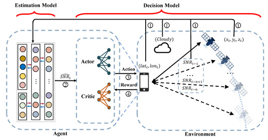 The estimation model can be pre-trained using historical information. Finally, the output of the estimation model is passed to the actor-critic network as input in the decision model. Accurate prediction of the SNR at this moment is crucial, which is the basis upon which the decision model can make correct decisions.