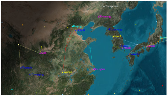 We chose the first phase of SpaceX’s Starlink as the low earth orbit constellation as simulated in the system tool kit (STK), and the scenario of the simulation is shown in Figure 4. Starlink is a constellation of 72 orbits and 22 satellites in each orbit. The inclination of each orbit is 53°, and the satellite’s altitude from the ground is 550 km. As the satellite’s altitude is only 550 km, we can consider that the earth is approximately flat on such a small scale. Using the trigonometric function, we can determine that the satellite can communicate with an area below that can be represented by a circle of radius of 573.5 km. Furthermore, we can find that the satellite can communicate with users whose straight-line distance is as far as km.