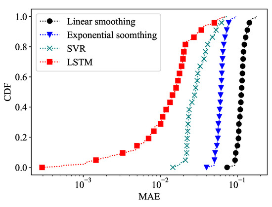 The test results are shown in Figure 5, where the vertical axis is a cumulative distribution function (CDF) plot composed of the test results from different locations around the world. These results indicate that the proposed method performs better than other algorithms in the vast majority of worldwide locations. Even in the worst-performing locations, the MAE of the proposed method is less than 0.07.