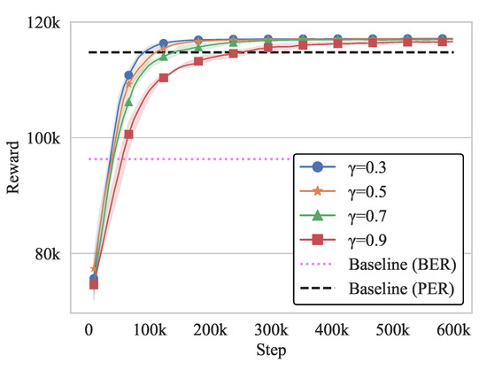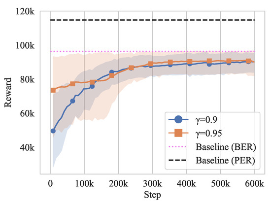 To demonstrate the importance of the estimation model, we selected the data rate without using the estimation model and used the agent to read the data directly from the environment. The results for when historical information is fully considered, for example, when is 0.9 or 0.95, are shown in Figure 6. The network can sometimes learn the correct strategy for choosing the data rate, but the variance is enormous and does not ensure the system’s stability. Moreover, the performance is lower than the baseline even after the network converges. Experiments also show that when is smaller than 0.9, such as when is 0.5 or 0.7, the training results are a straight line, indicating that the network cannot learn to select a data rate effectively. When is more significant than 0.95, for example, when is 0.99, the network fails to learn the correct strategy because it overlooks historical information.