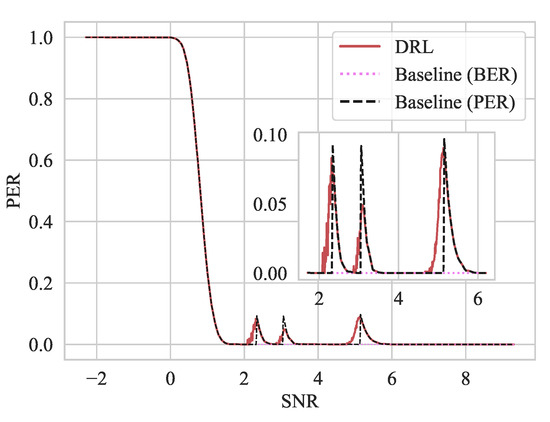 To explore the reason for the throughput improvement, we plotted the PER performance of different methods at different SNRs, as shown in Figure 8. When the SNR is very low, the PERs of all methods are high. When the SNR is high, the PERs of the different methods are all 0 and, again, there is no difference.