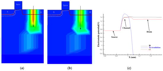 The SET simulations were performed on Sentaurus TCAD, applying a Fermi−Dirac statistics and hydrodynamic model, taking into account the effects of doping, electric field, carrier−carrier scattering, and interface scattering on mobility, as well as the effect of band-gap narrowing, while the temperature was set at 25 °C. The simulation results of Bi−923.2MeV and Cl−158MeV are shown in Figure 2a,b, while the arrow direction is the vertical 90−degree incident direction of the heavy ions. The SET horizontal track widths under irradiation can be obtained at about 1 µm. The electrostatic potential distribution is shown in Figure 2c. The SET sensitive area generated by the heavy ions is mainly on the drain region of the device in the off state. At this time, the drain PN junction is at a reverse bias, and a depletion region is formed, which is the main region for collecting charges. The holes induced by radiation are collected at the drain, resulting in the potential of the drain increasing.