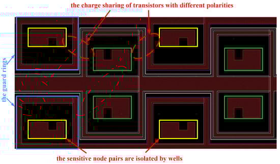 Charge sharing comes from diffusion effects in NMOS, which is the main course of SET on the double-well process, while for PMOS, charge sharing mainly comes from the bipolar amplification. The guard rings and contact holes are designed to speed up the collection of interfering charges to reduce the SET pulse width. In addition, it is also necessary to strengthen the charge sharing of transistors with different polarities. With the guidance of the SET width obtained by simulation, the isolation of the sensitive node pairs is realized by introducing another complementary well between the same phase nodes. The distances between the same phase nodes are designed to be greater than 2 µm, as shown in Figure 3. In this way, the charge between the same polarity transistors can be eliminated, and the charge deposited on the sensitive nodes is reduced.
